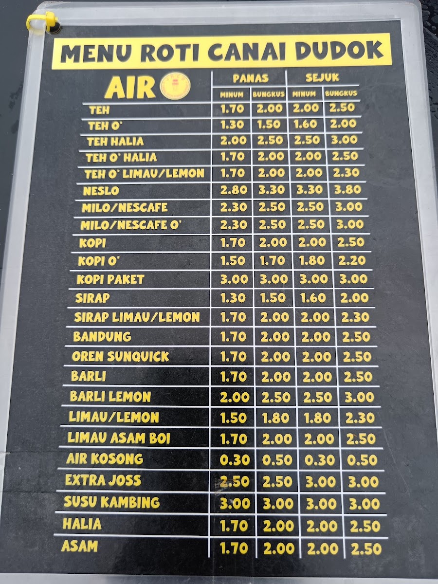 Jamal Roti Canai Dudok in Jalan Serdang, Kulim, offers a nostalgic Malaysian dining experience centered around its signature roti canai. The highlight of the menu is undeniably the roti canai banjir, served generously with rich chicken curry and dhal, creating a comforting, flavorful combo that captures the essence of local street food. Though some say the iconic gravy has mellowed over time, the overall taste remains satisfying for both locals and visitors. Beyond roti canai, the menu extends to classic favorites like roti jala, nasi lemak, and even Malay-style French toast, showcasing the diversity within traditional Malay cuisine.